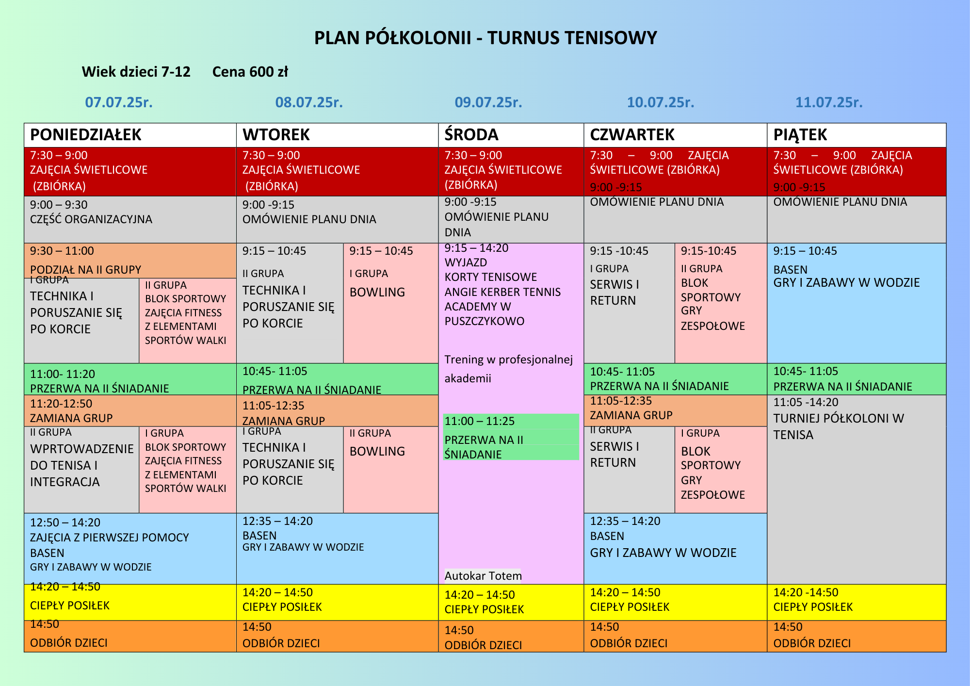 I Turnus: 07.07 – 11.07.2025 – tenisowy
