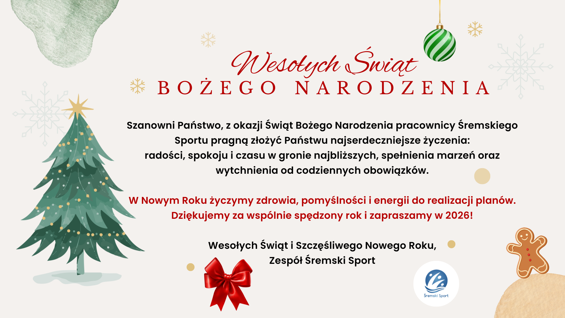 Zdrowych, spokojnych Świąt Bożego Narodzenia oraz pomyślności w Nowym Roku 2026 składa: Śremski Sport