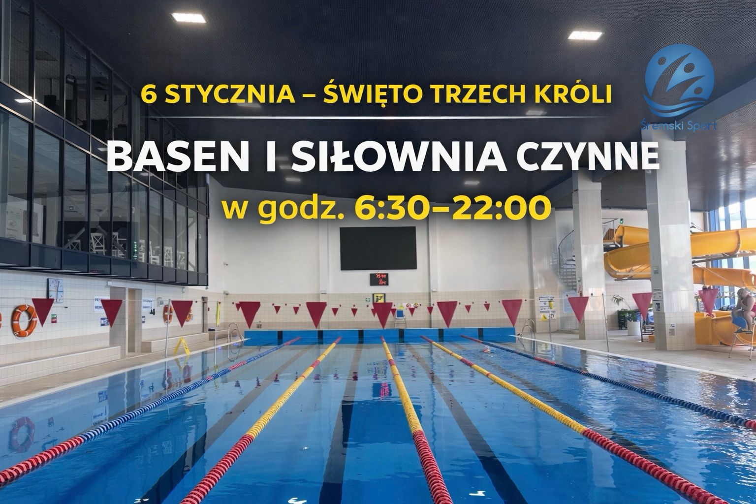 Informujemy, że w dniu 6 stycznia (Trzech Króli)  obiekt jest czynny w godzinach  od 6.30 do 22.00
