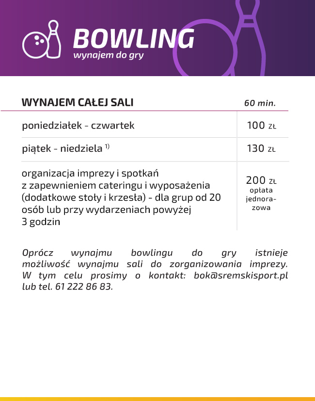 • Kasa Obiektu: 61 222 86 80; bok@sremskisport.pl